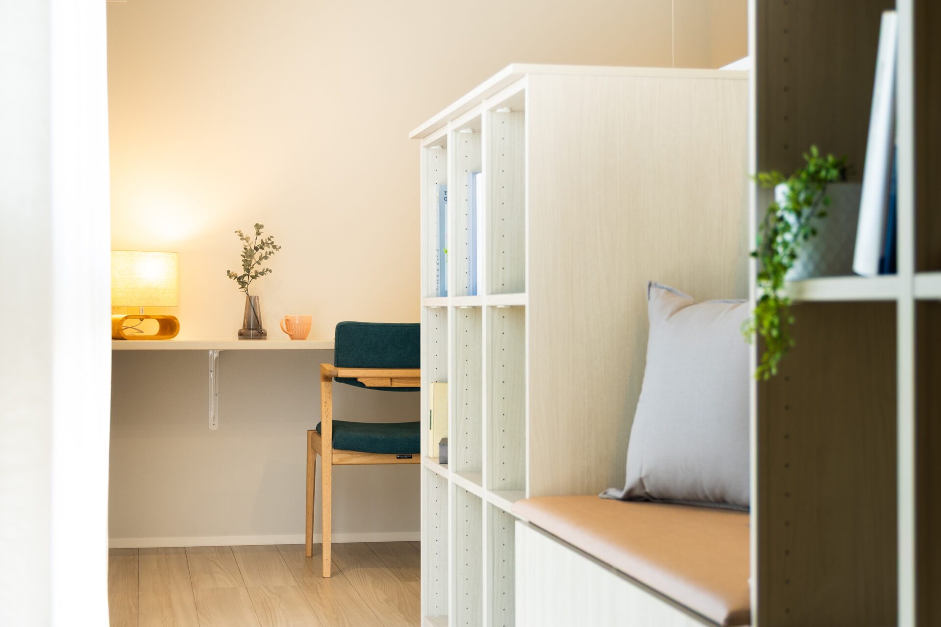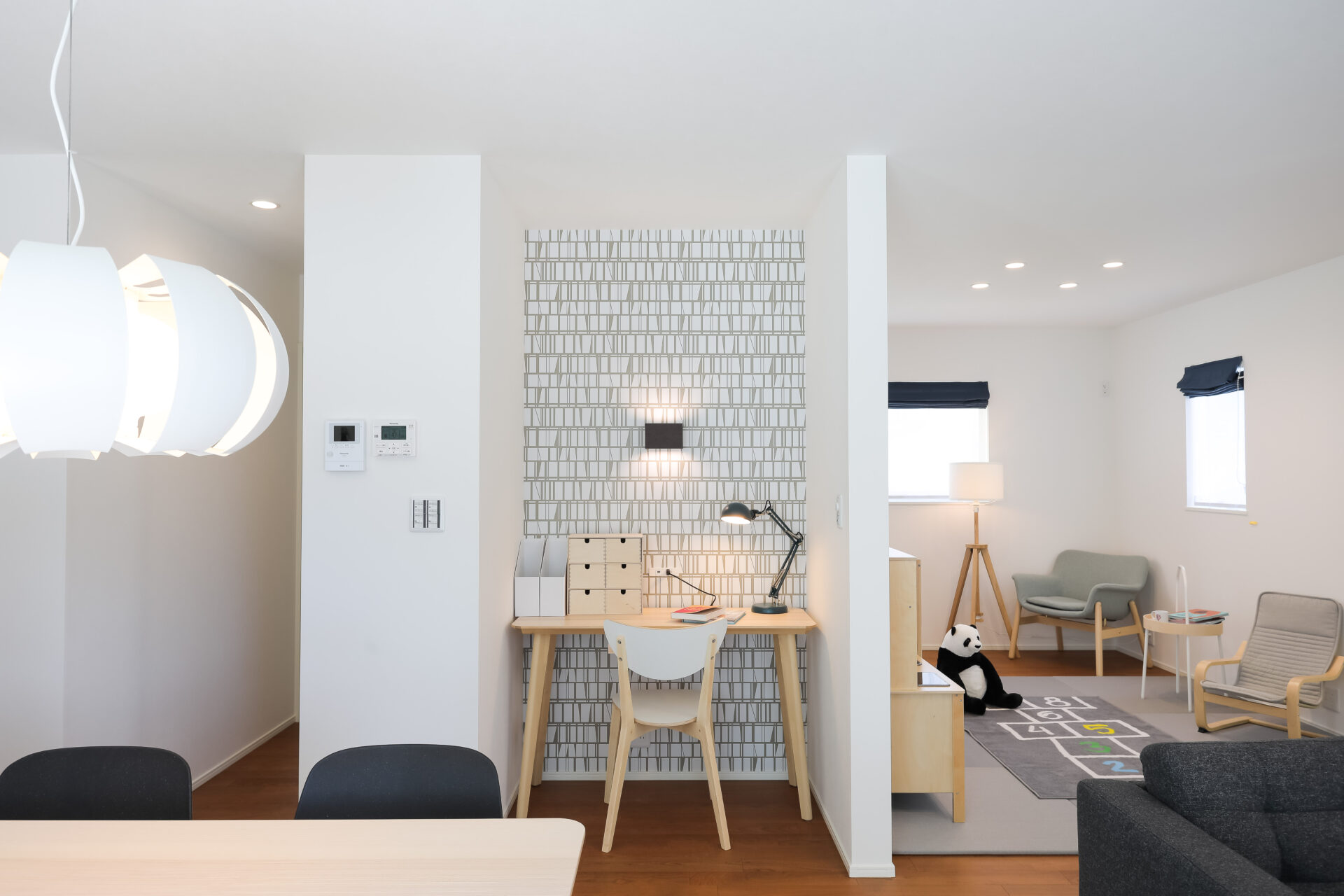 LDKの一角には、スタディーコーナーや置きタタミのプレイルームを配置しました。リビングで過ごす家族の気配を感じながら、子どもが勉強したり遊んだりできる空間です。独立した部屋ではなく、あえてオープンなスペースにすることで、家族のコミュニケーションが自然と生まれる工夫がされています。