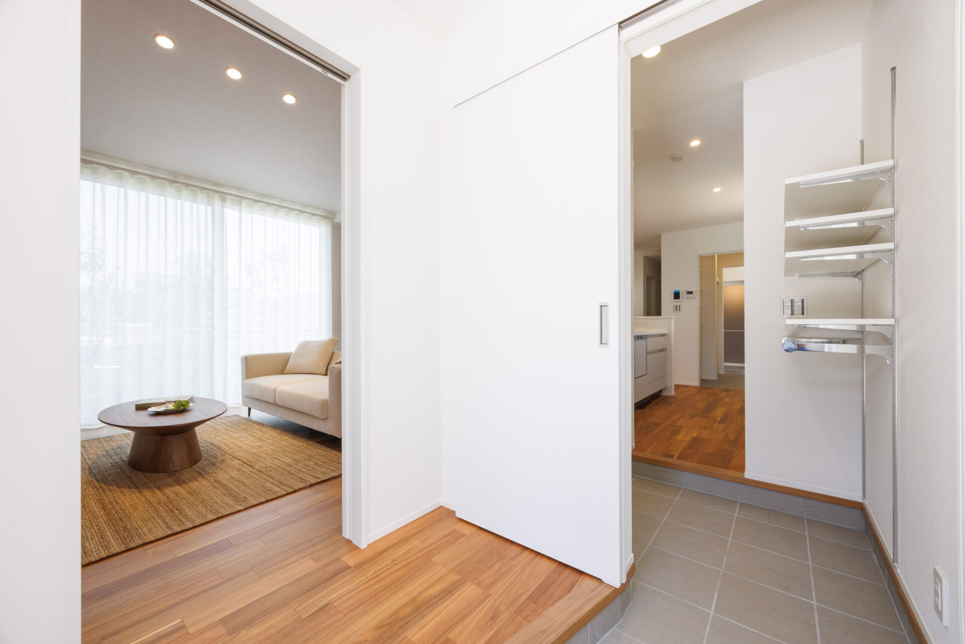 また、家族用玄関と来客用玄関を分けることで、玄関周りをすっきりと保てる工夫も取り入れられています。