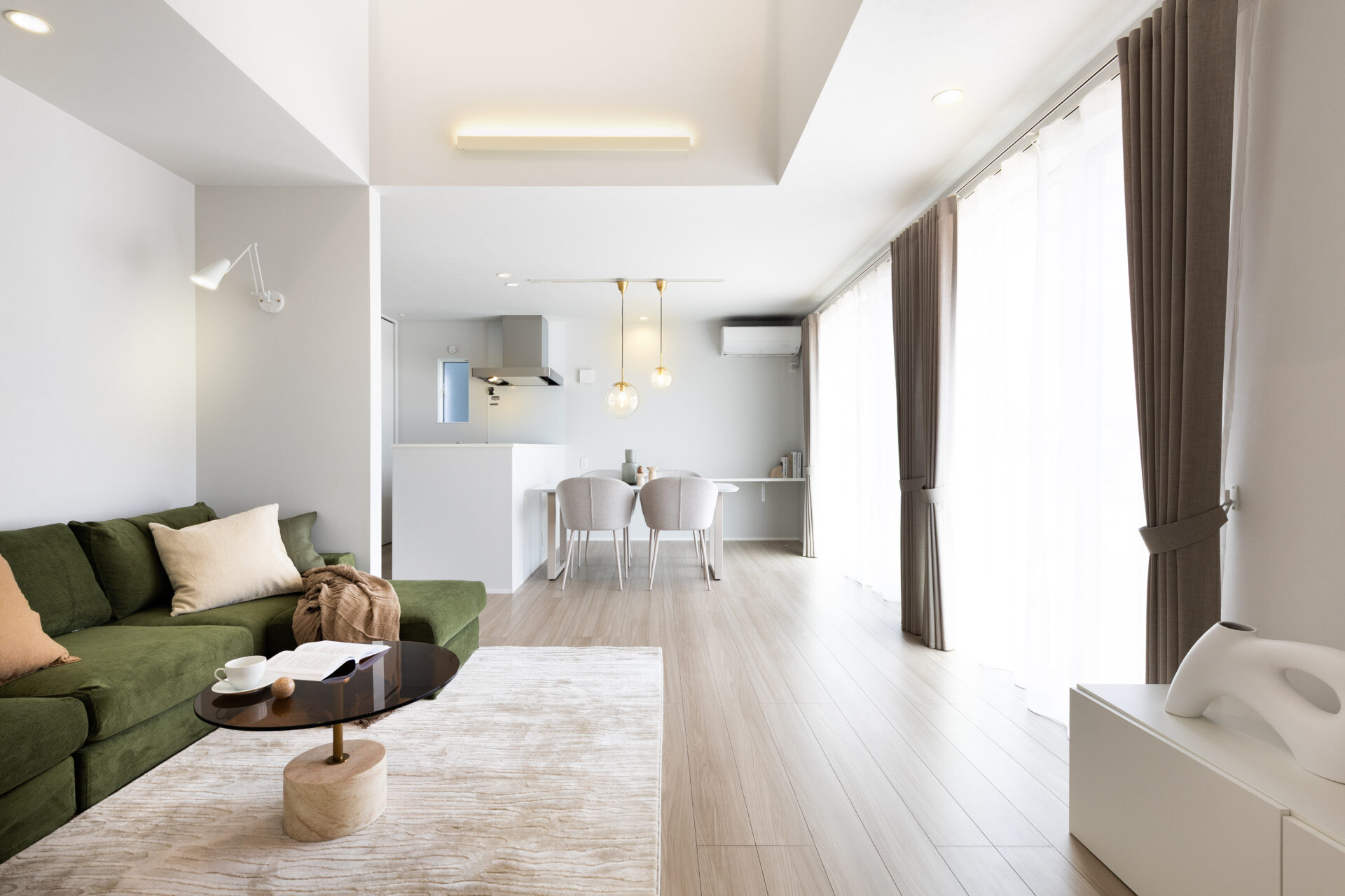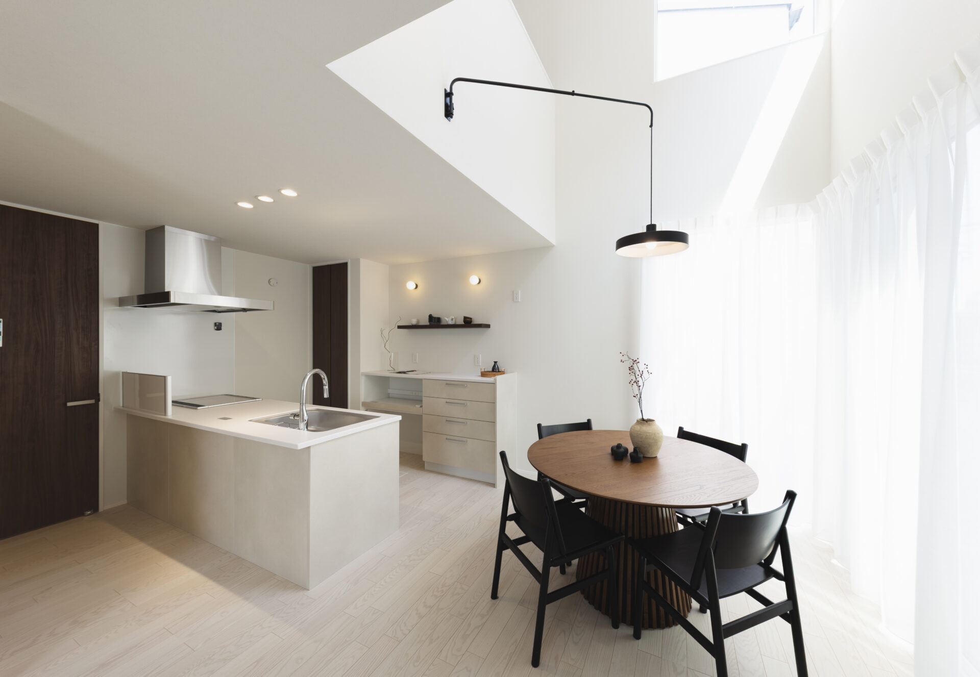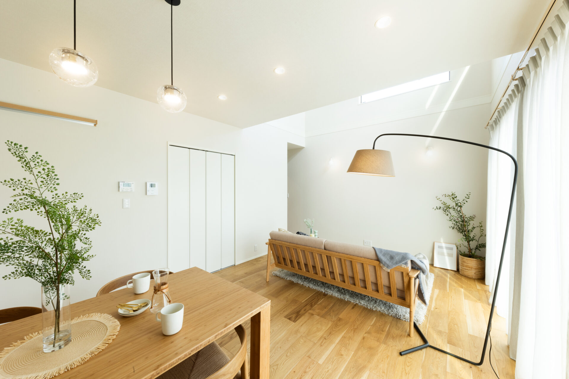 約20帖の広々としたLDKに設けられた吹き抜けと、南側の大開口窓の組み合わせにより、曇りや雨の日でも明るい家族団らんの空間を実現しています。ダイニングキッチンとリビングをゆるやかに分けることで、それぞれの空間に適した雰囲気を保ちながら、吹き抜けによる一体感も感じられる絶妙なバランスとなっています。