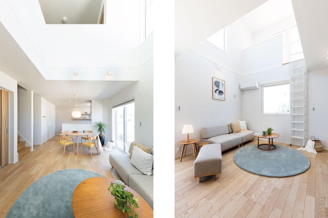実際の建築事例を見ることで、吹き抜けのある家の魅力がより具体的にイメージできるでしょう。以降では、トコスホームが手がけた2つの事例をご紹介します。それぞれ異なるアプローチで吹き抜けを活用し、家族のライフスタイルに合わせた快適な住まいを実現しています。限られた敷地面積でも、工夫次第で開放的で機能的な吹き抜け空間を作れるため、ぜひ参考にしてください。