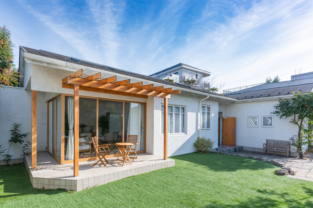 この事例の特徴は、大開口窓の先に広がるタイルデッキとつながるリビングです。窓を開ければ半屋外のような心地よさを楽しめ、外とつながる開放感と光あふれる空間が魅力的です。