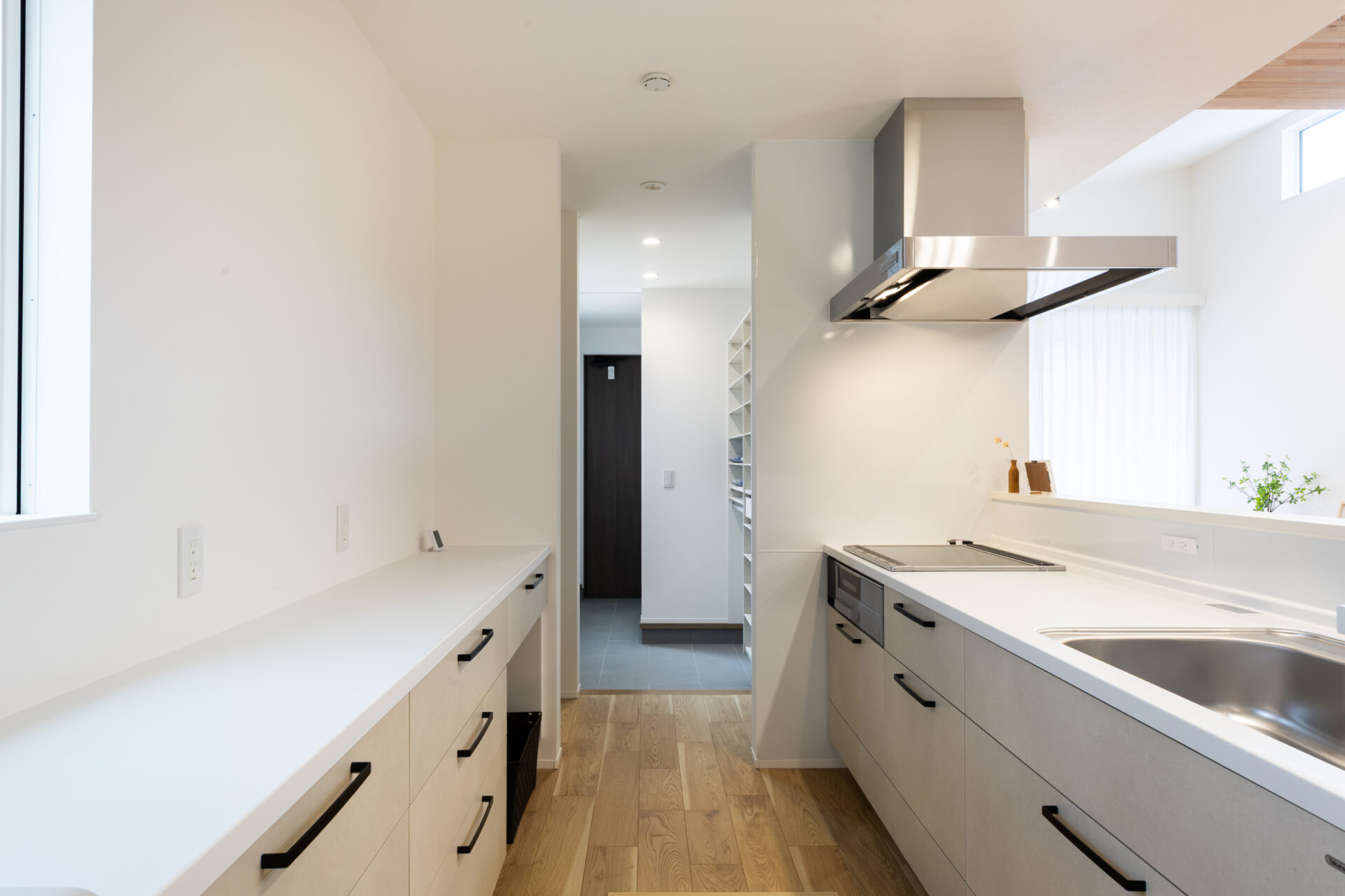 家事動線も秀逸で、ドライルーム・ファミリークローゼット・キッチンがつながる行き止まりのない回遊動線により、家の中の移動がスムーズです。毎日の家事が少しでも楽になるように工夫されています。