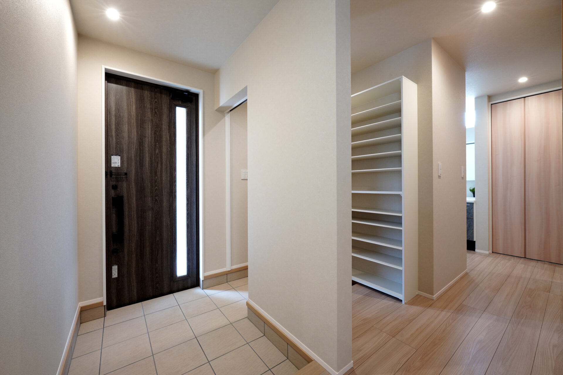 帰宅動線にも配慮が行き届いています。玄関から洗面室、ファミリークローゼット、リビングへとつながるスムーズな動線により、帰宅後すぐに手洗いや片付けができ、生活のしやすさと清潔な習慣を両立しています。