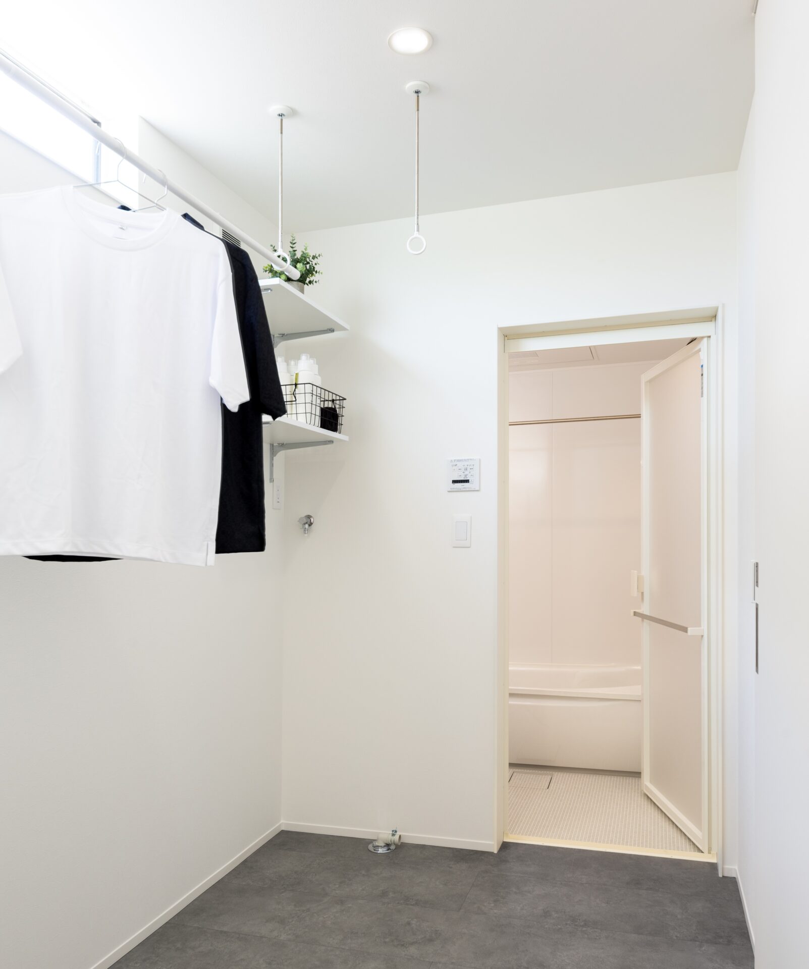 理想的なのは、「洗面室⇔ランドリールーム⇔ファミリークローゼット⇔寝室」という動線です。脱衣所で脱いだ服をすぐに洗濯機へ、洗濯が終わったらその場で干し、乾いたらファミリークローゼットへ収納、そして各自の部屋へ持っていくという流れが、最短距離で完結します。重い洗濯物を持って階段を上り下りしたり、長い廊下を移動したりする必要がなくなり、体への負担も大幅に軽減されるでしょう。