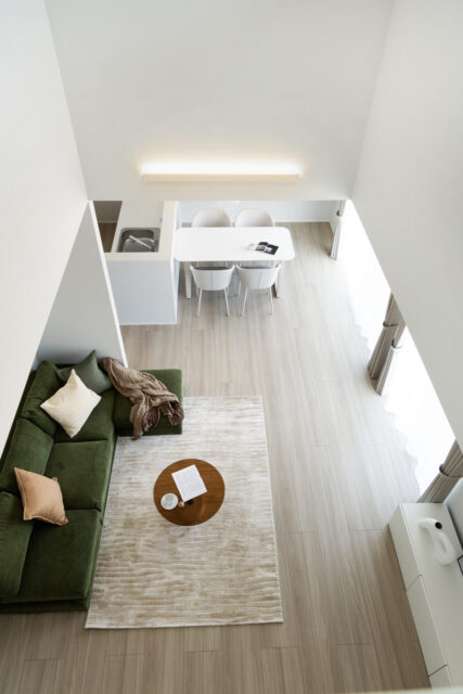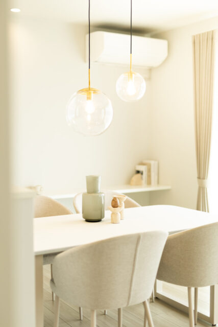 ダイニングキッチンとリビングをゆるやかに分けたLDKは約20帖。吹き抜けと南側の大開口窓からたっぷりと光を取り込み、雨や曇りの日でも家族団らんの空間を明るく照らしてくれます。 -
