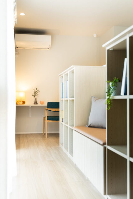 2階ホールは、カウンターデスクと本棚を造作しライブラリースペースに。カフェのような空間で読書をしたり、趣味を楽しんだり、兄弟並んで宿題をしたりと、共有空間にも1人空間にも使えるスペースです。吹き抜けからリビングとつながっているため、家族の気配も感じられます。