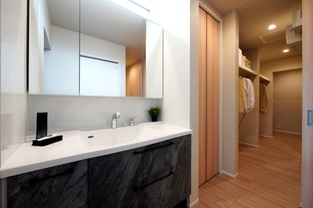 玄関から洗面室、ファミリークローゼット、リビングへとつながるスムーズな動線設計。帰宅後すぐに手洗いや片づけができ、生活のしやすさと清潔な習慣を両立します。