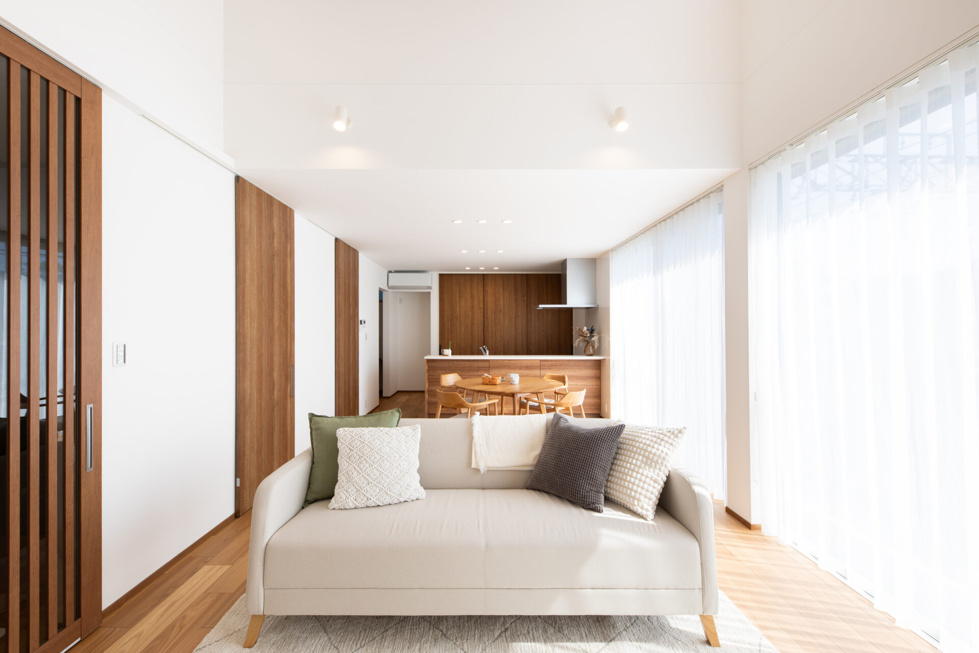 玄関からは洗面・ドライルームと、リビングへの2WAY動線を確保。帰宅後の手洗いや片付けがスムーズにでき、LDKをすっきりキープします。各居室の入り口はLDK内に設け、家族が自然と集まるレイアウトにしました。