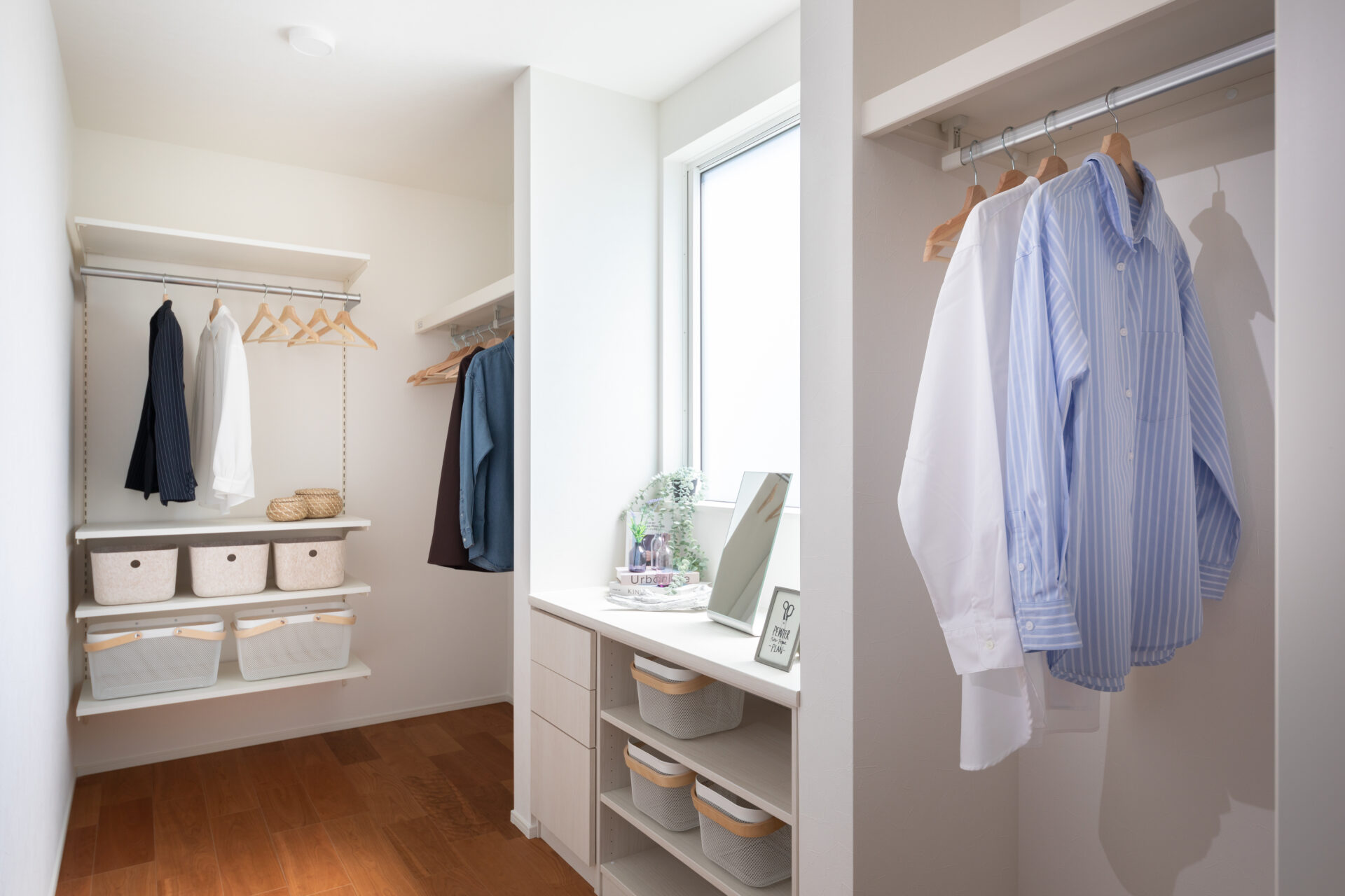 キッチンとパントリー、ドライルームが一直線につながっているので、洗濯と調理の同時進行もラクラク実現。乾いた洗濯物は、ドライルーム横のウォークインクローゼットへハンガーごと移動。家事時間がぎゅっと短縮できます。