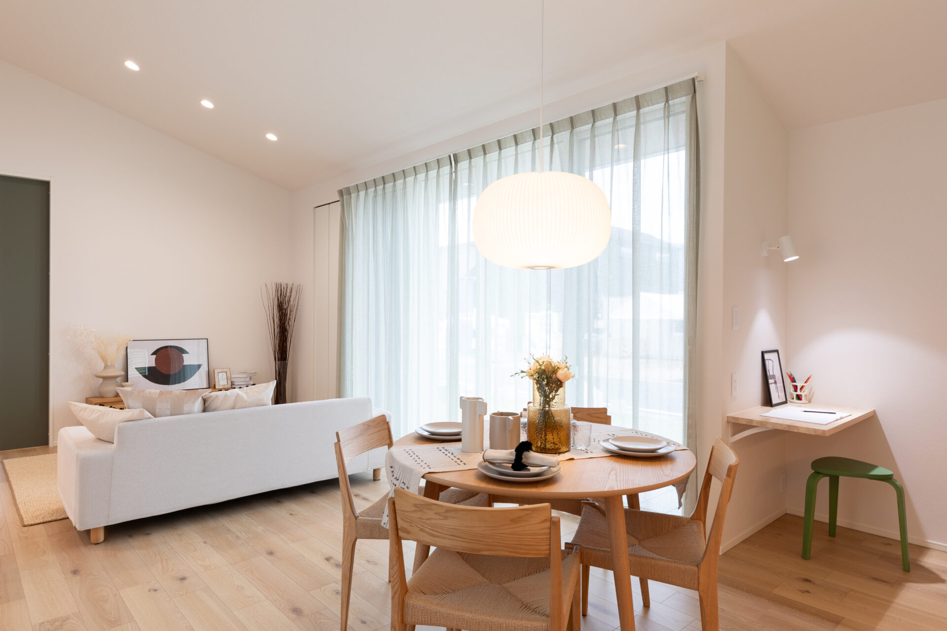 4枚の大きな掃き出し窓から自然光が差し込むLDKは、明るくて開放感抜群。キッチンからリビングまで真っ直ぐにつながったレイアウトと、テラスにつながる東窓が抜け感を生み、面積以上の広がりを感じさせてくれます。
