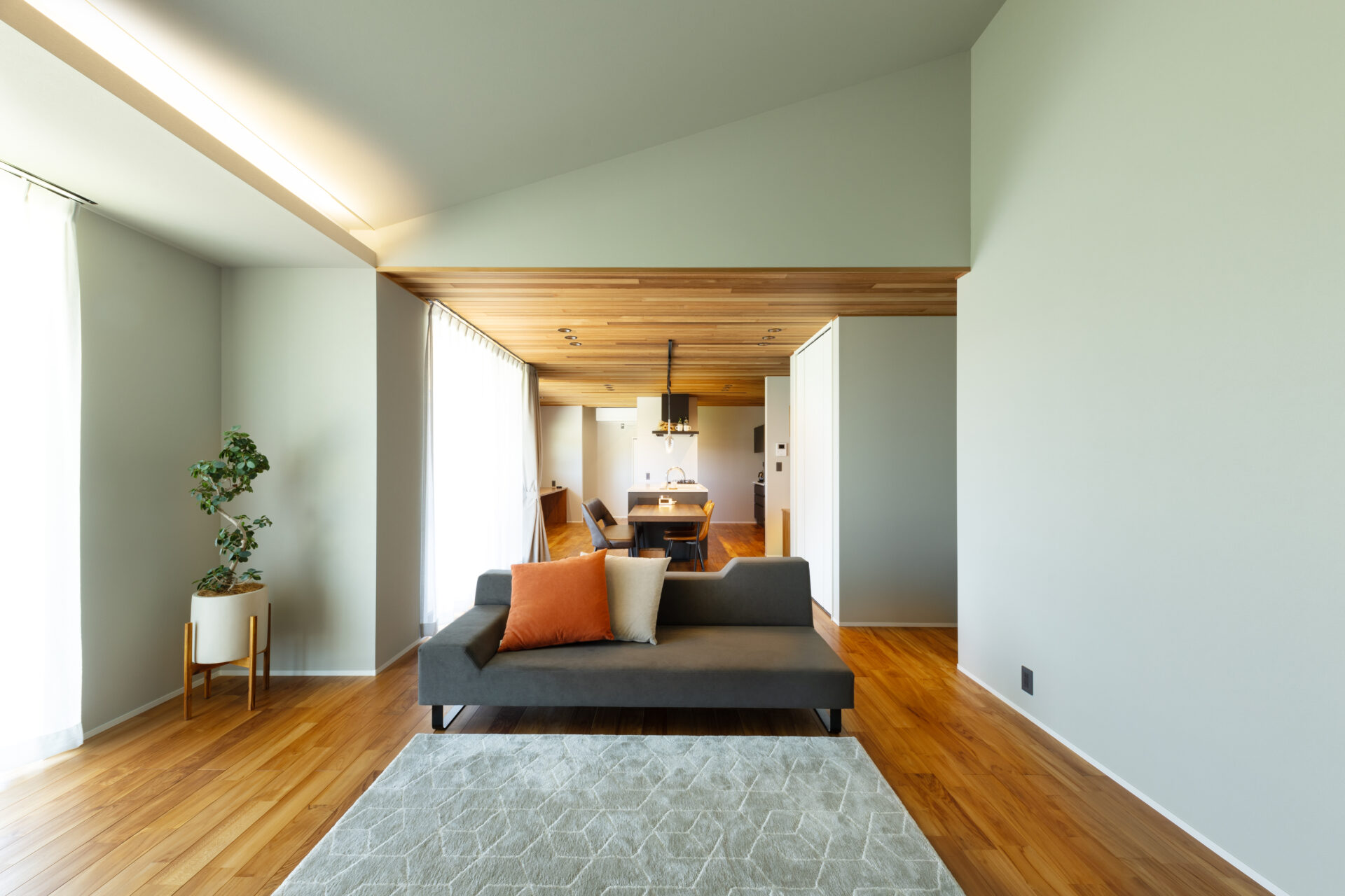 テラスとつながったリビングには勾配天井を採用。視界が縦横に抜けることで、空間が一段と大きく感じられます。テーブルとチェアをセットすれば、テラスは室内とゆるやかにつながりサブリビングに。内と外の視界を感じさせない、心地よい自然の空間と時間を楽しめます。