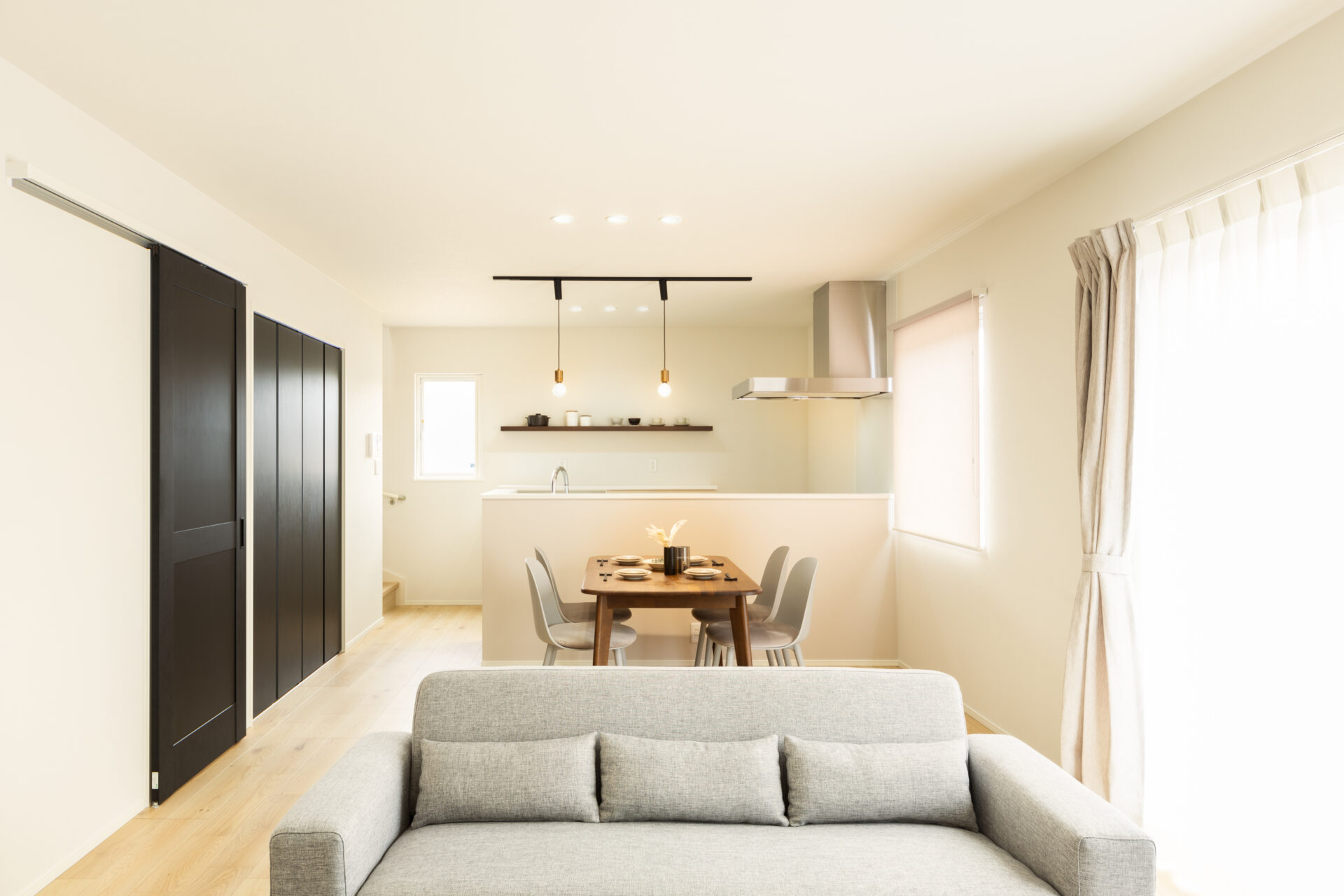 キッチンから空間全体を見渡せるので、家族との距離が近く、自然と会話も生まれやすい間取りです。
