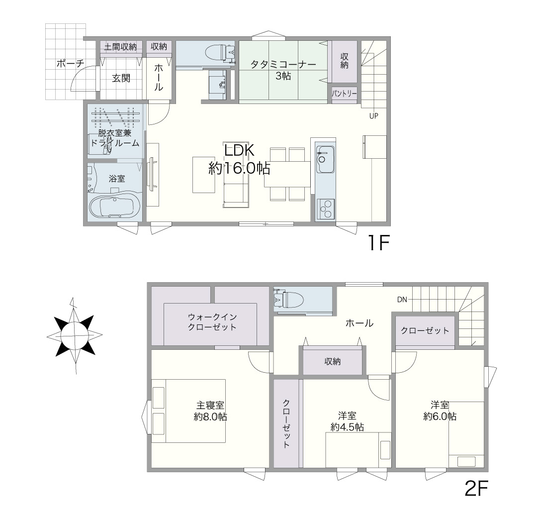 土間収納、タタミコーナー収納、ウォークインクローゼットなど、用途に合わせて適材適所にたっぷり収納を設けました。