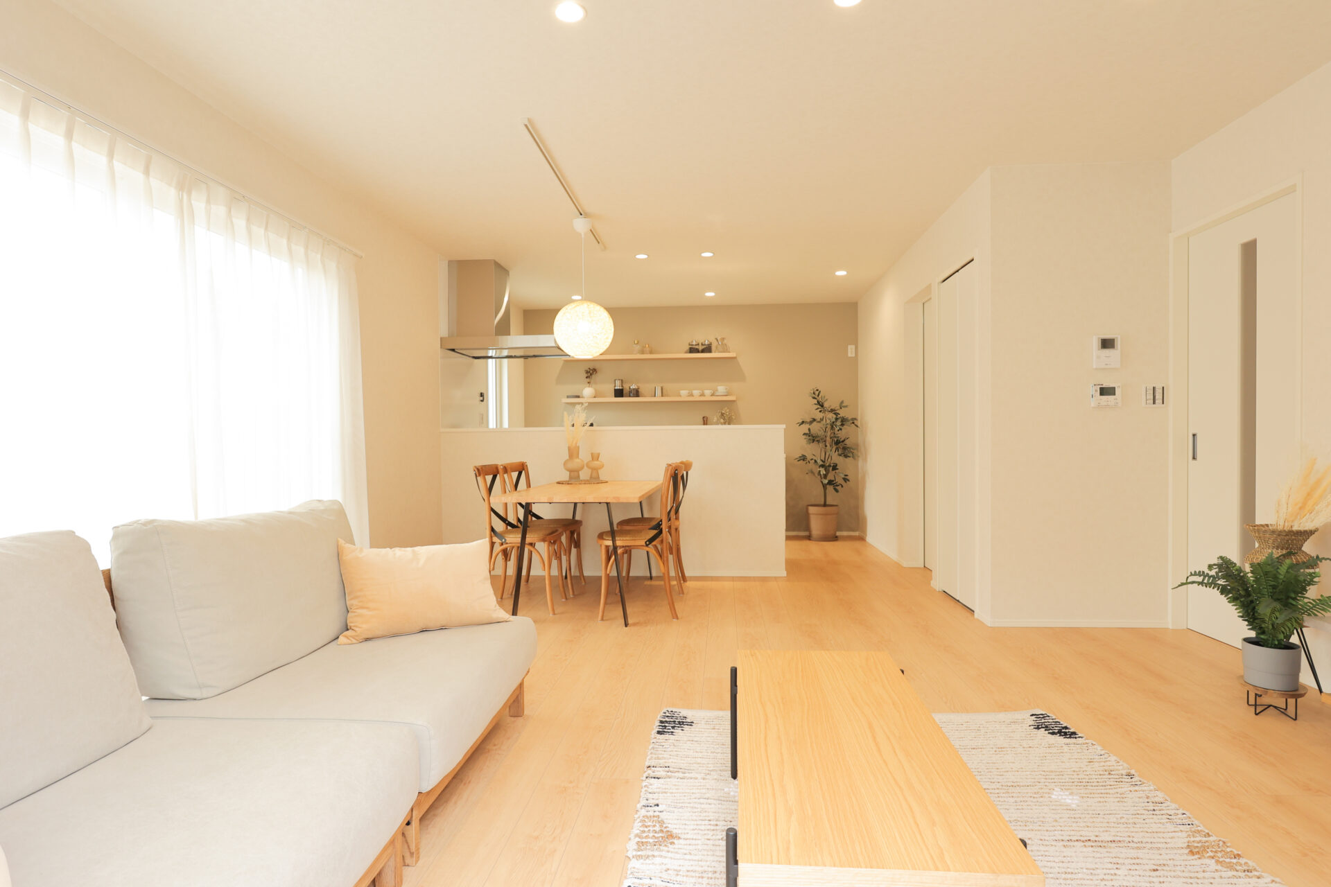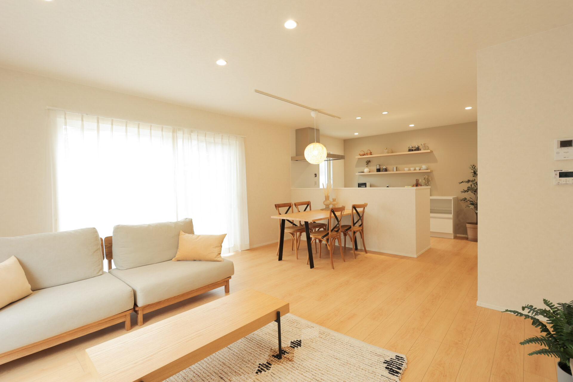キッチンからリビングまでI型にレイアウトしたLDKは、畳コーナーをつなげると23帖の大空間に。リビングに配したL字のハイサッシが抜け感も生み、奥行きを感じるフロアでゆったりとくつろぐことができます。ダイニングにはデッドスペースが少ない円形テーブルを採用。暮らしの変化に応じて、家具や植物、インテリアを加えられる余白を持たせました。