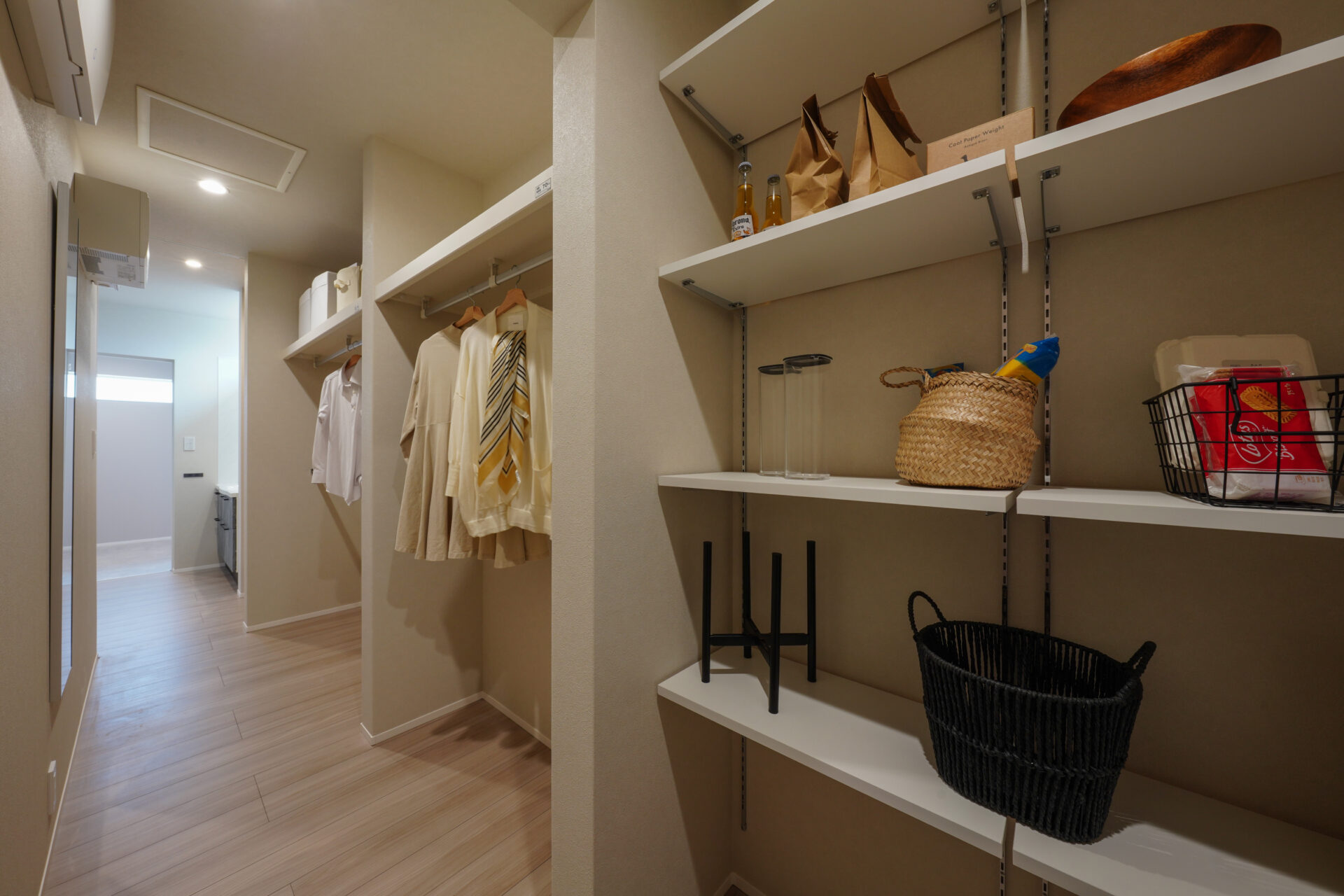 キッチン、パントリー、ファミリークローゼット、ドライルームが一直線につながっているので、料理と洗濯を同時進行できます。両サイドに可動棚がついたパントリーは収納量抜群。ストックした食品や日用品の出し入れもスムーズです。乾いた洗濯物はハンガーのままクローゼットへ。全ての家事が1階で完結し、まるで平屋のようなワンフロアな暮らしが叶います。