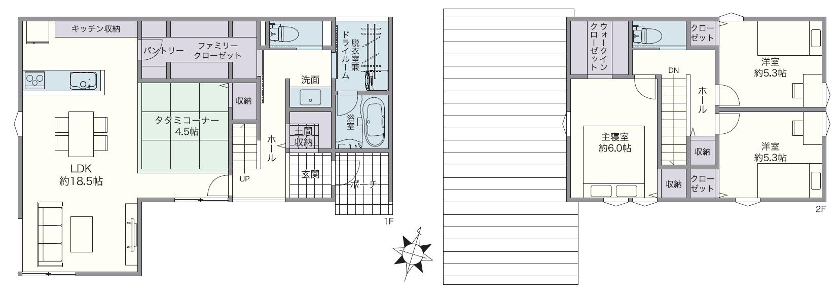 土間収納付きのファミリー玄関からは、リビングフロアを通らずに洗面室や浴室、クローゼットへ向かう動線を確保。外出先から帰ってすぐに手を洗ったり着替えたりできるので感染症対策ができ、お子様の衛生習慣も自然と身につきます。パントリーやキッチンへもつながっているので、買い物帰りの収納がとっても楽。LDKが散らかりにくく、すっきりキープできます。
