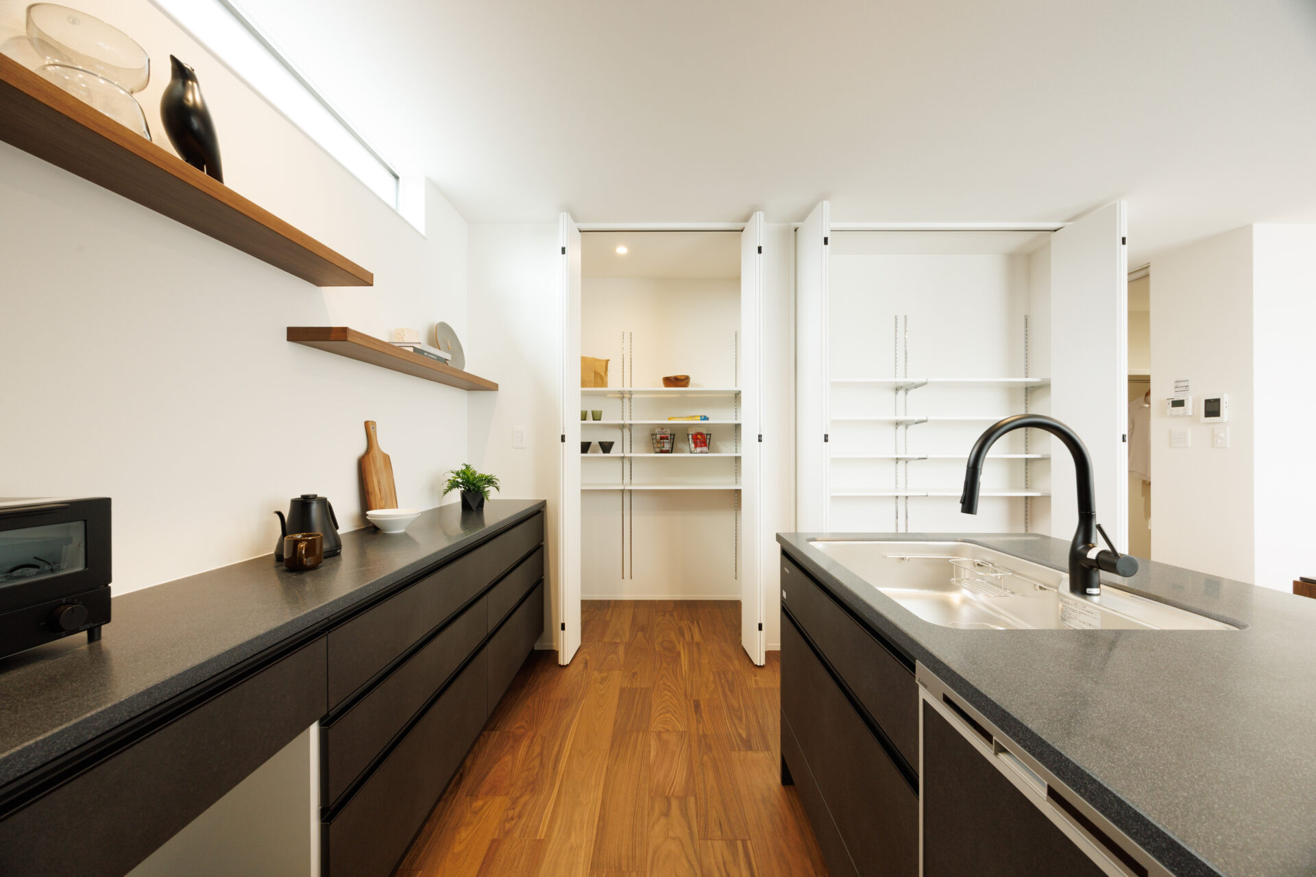 パントリーをはじめ、キッチンまわりには豊富な収納スペースを確保。食品のストックや調理器具もすっきり整頓でき、使いやすく快適なキッチン空間です。