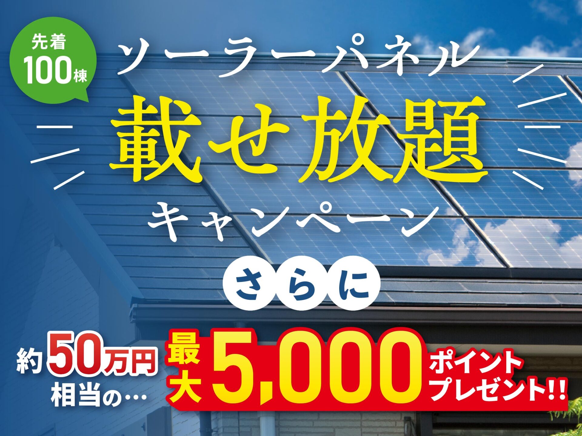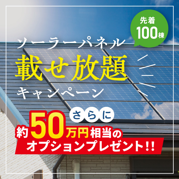 お得なキャンペーンがスタート!100万円相当のソーラーパネルを無料で搭載&50万円相当のオプションをプレゼント。家づくりを始めるなら、まさに今がベストタイミングです!